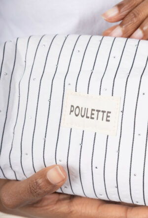 Chic et pratique, cette grande trousse rayée est parfaite pour tout emporter avec style ! Fermée par un zip doré, elle est parfaite pour glisser ton maquillage ou accessoires. Une superbe idée cadeau, pour celle que tu pourrais appeler « Poulette ».
