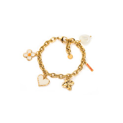 Multiples breloques dorées et blanches : fleurs, perle, coeur, « Amour »