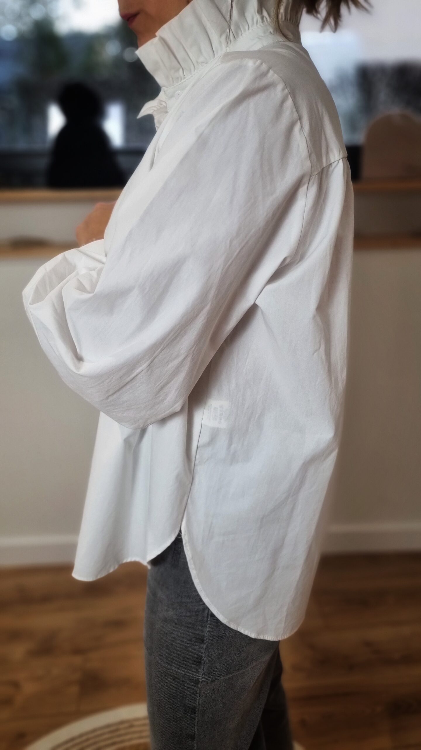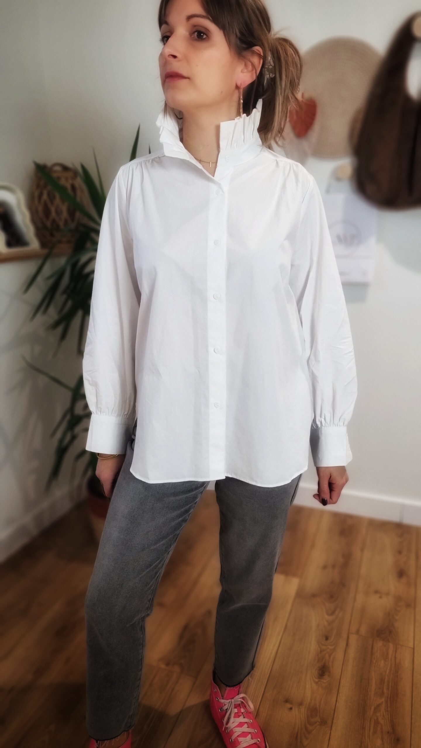 Chemise blanche femme à col montant volanté portée avec un jean🧥 Chemise Blanche Femme à Col Montant Volanté – Élégante & Intemporelle