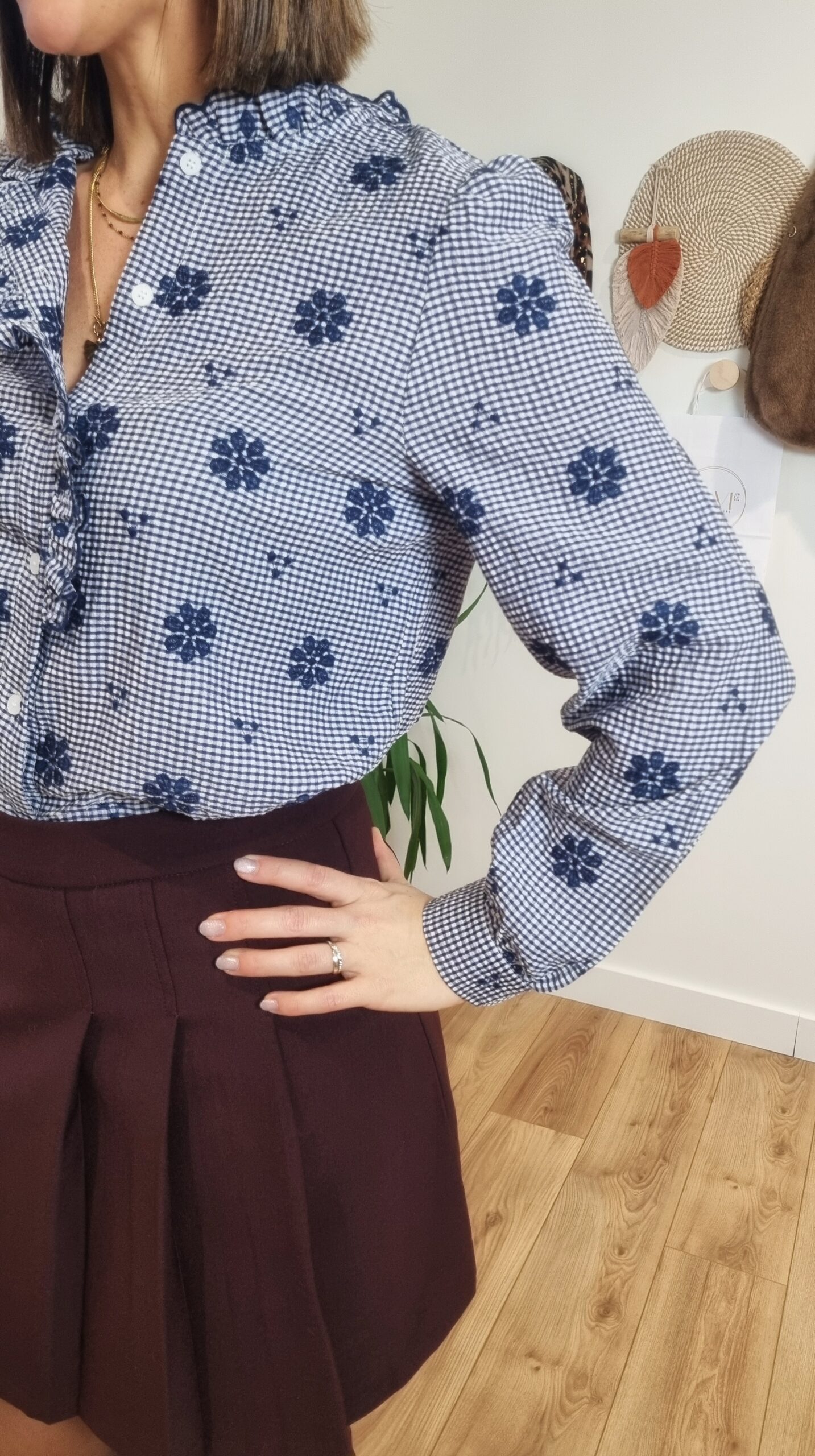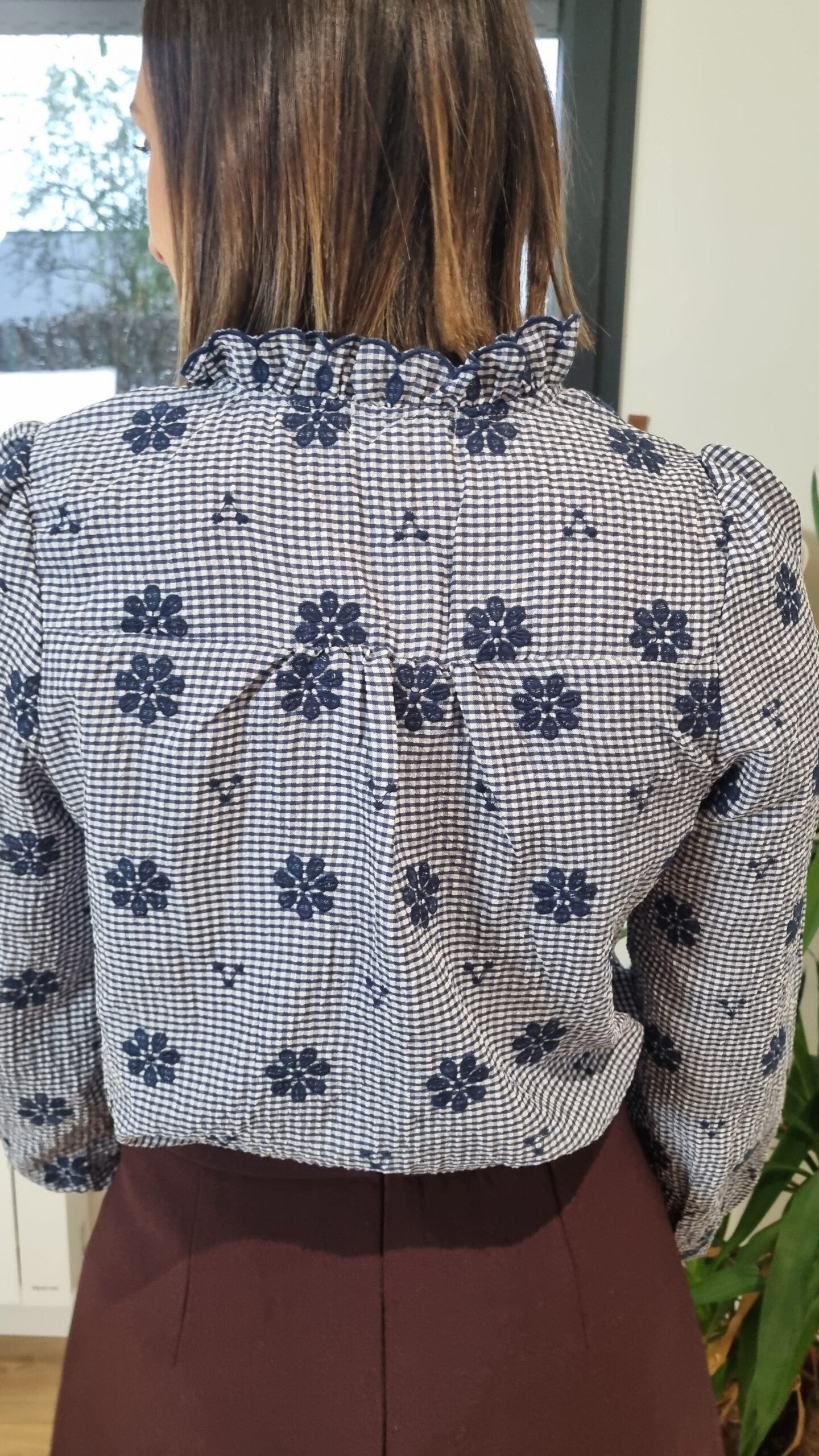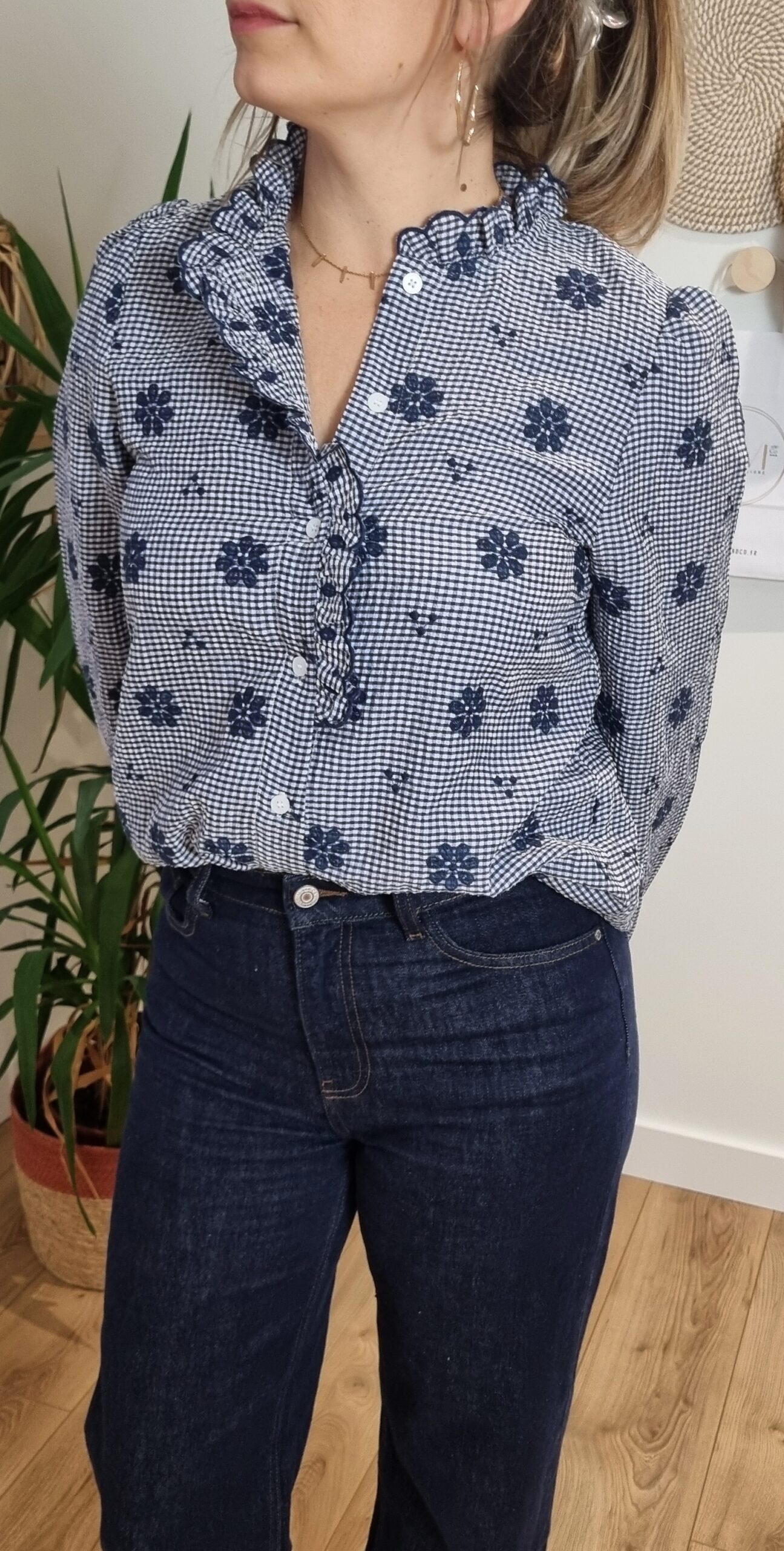 👚 Chemise Vichy Fleurie Bleu Marine – Volants & Manches Longues