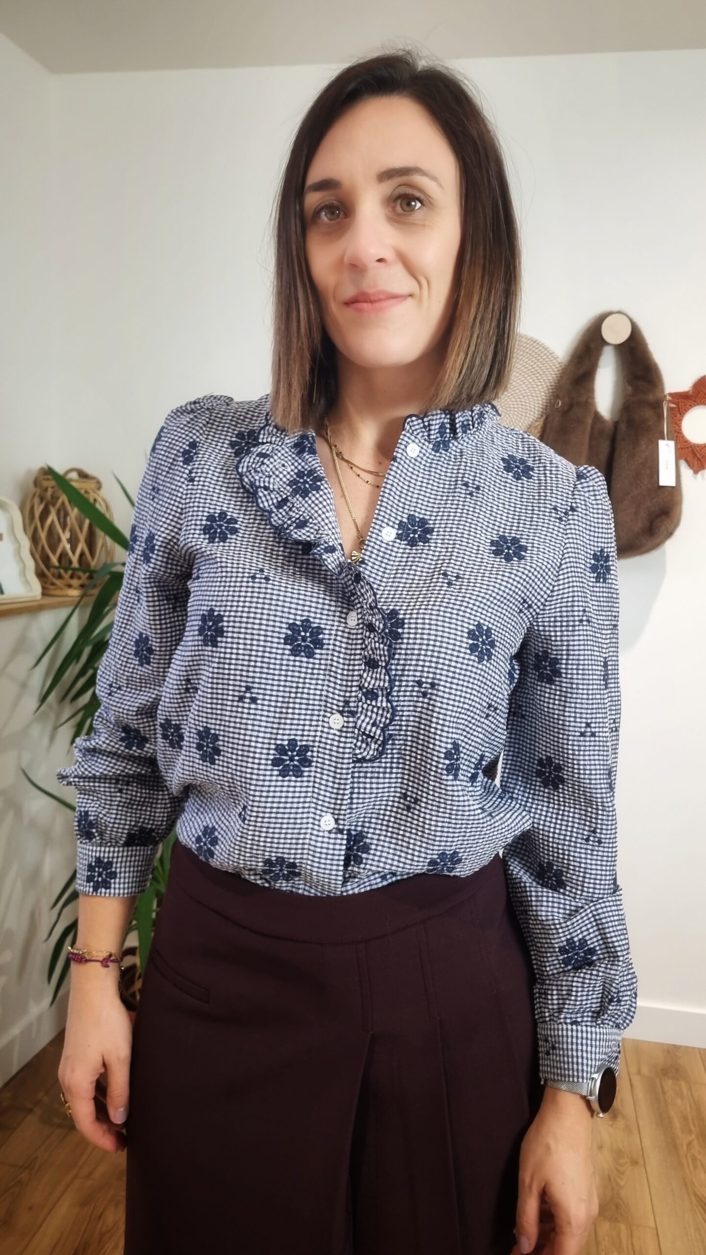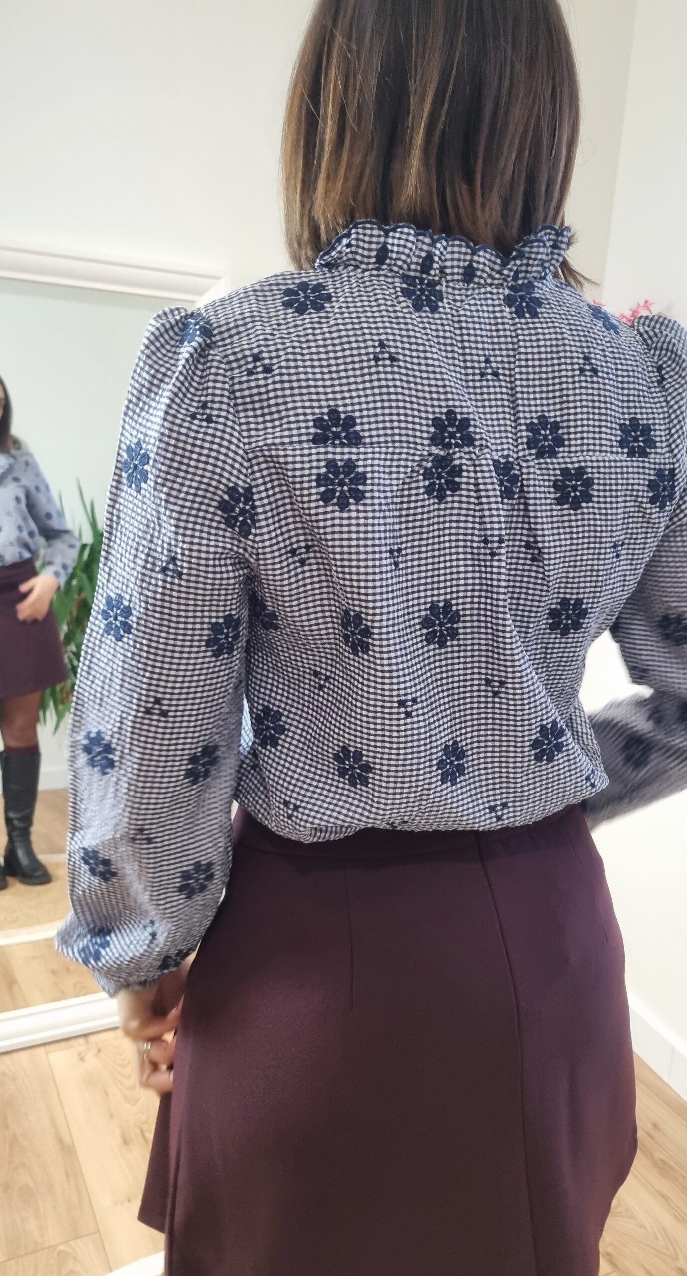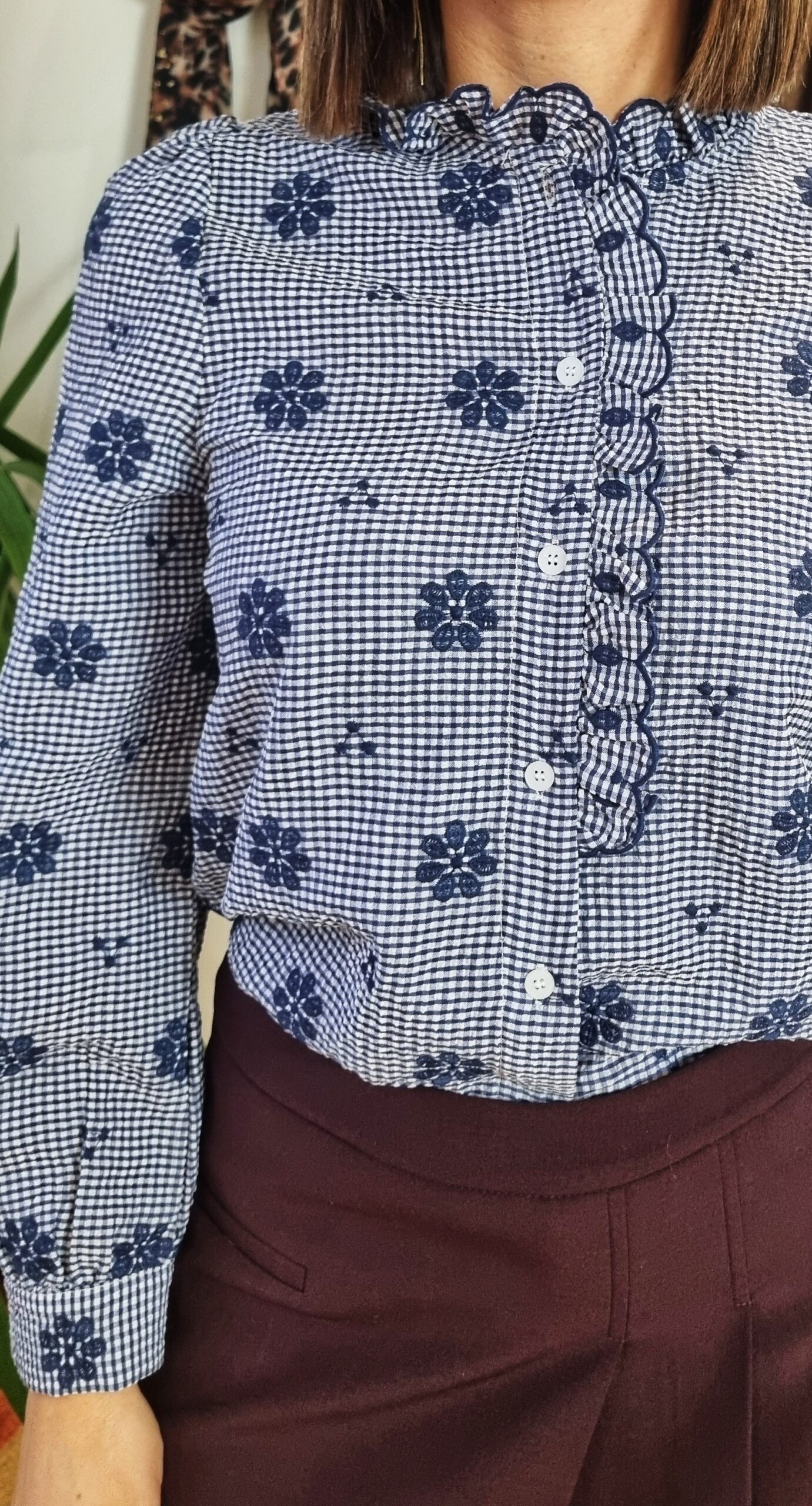 👚 Chemise Vichy Fleurie Bleu Marine – Volants & Manches Longues