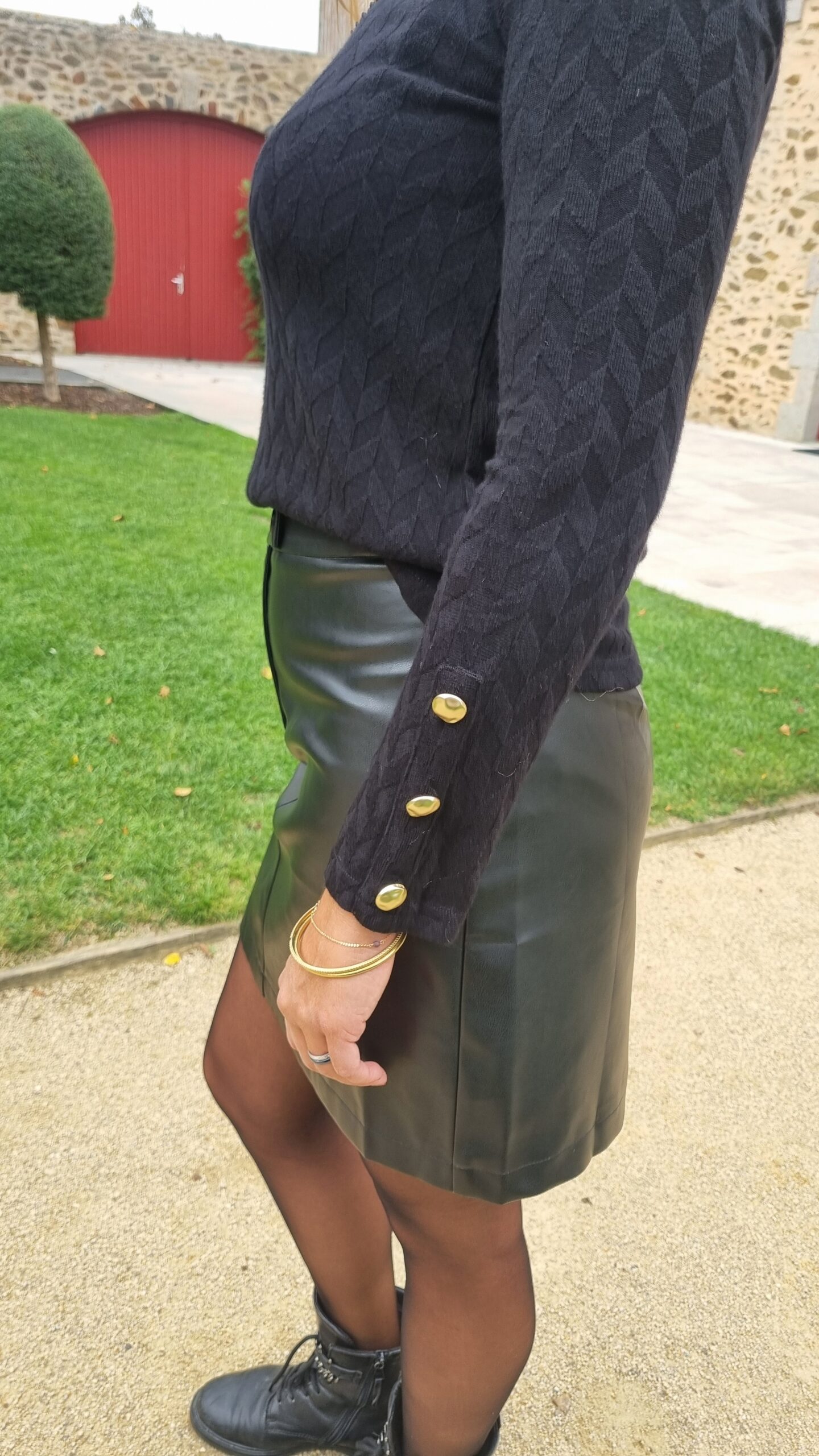 Fermeture par un zip, un bouton ton sur ton, et une pression
