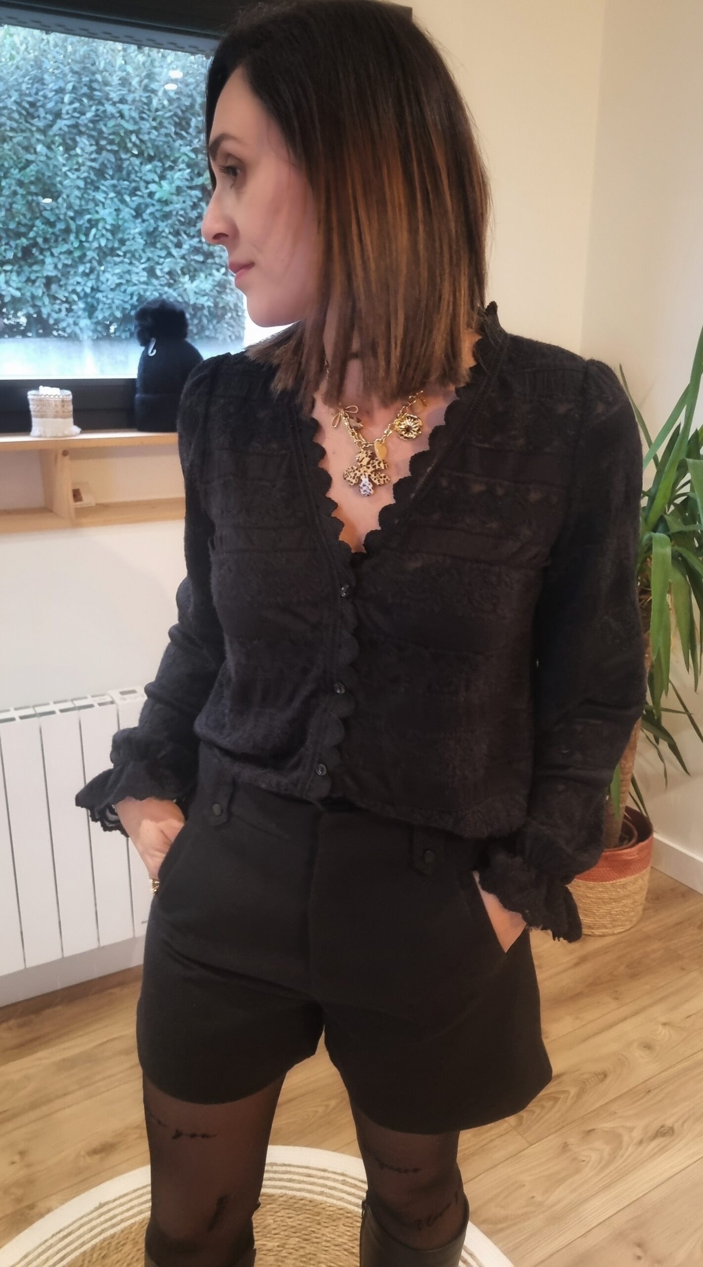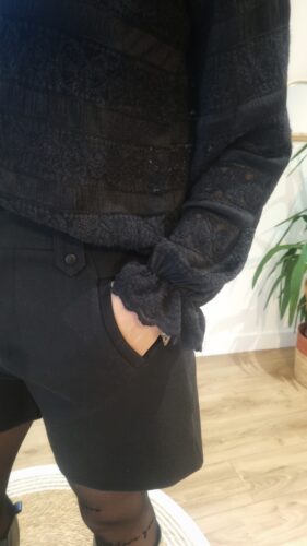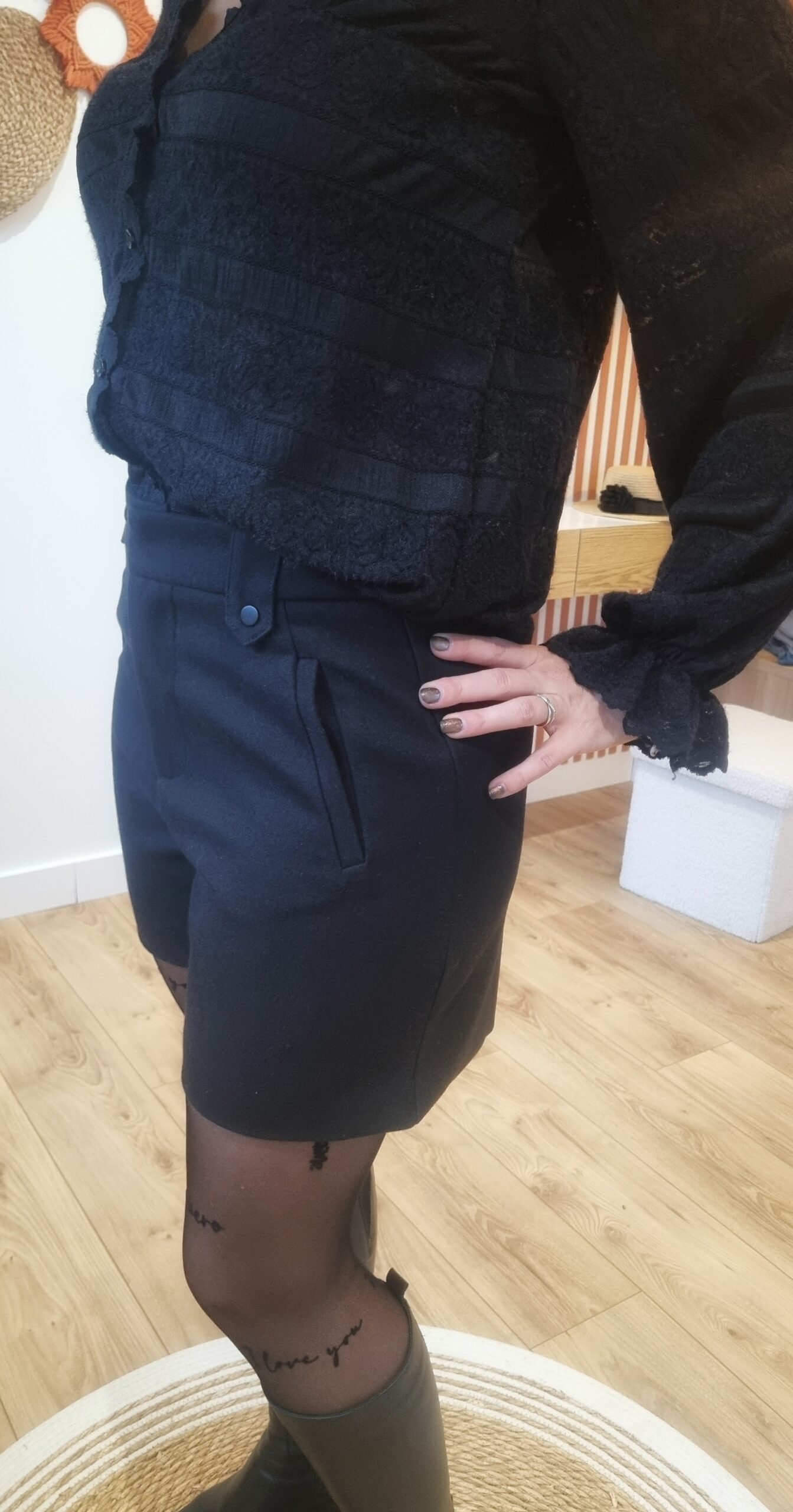 Short noir taille haute, coupe chic et droite, tissu épais légèrement stretch, poches latérales et détail boutonné à la taille. Élégant, confortable et longueur parfaite.