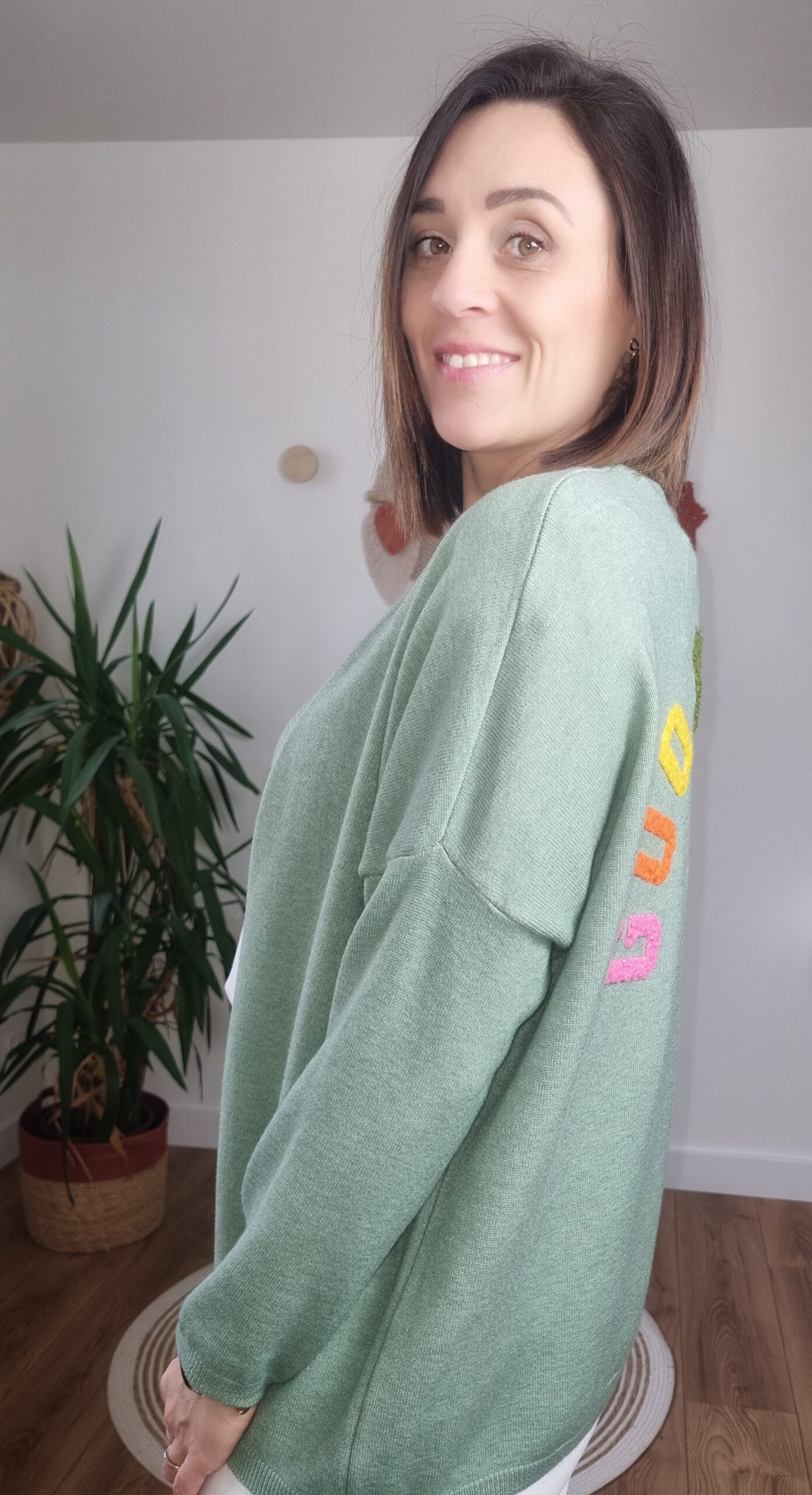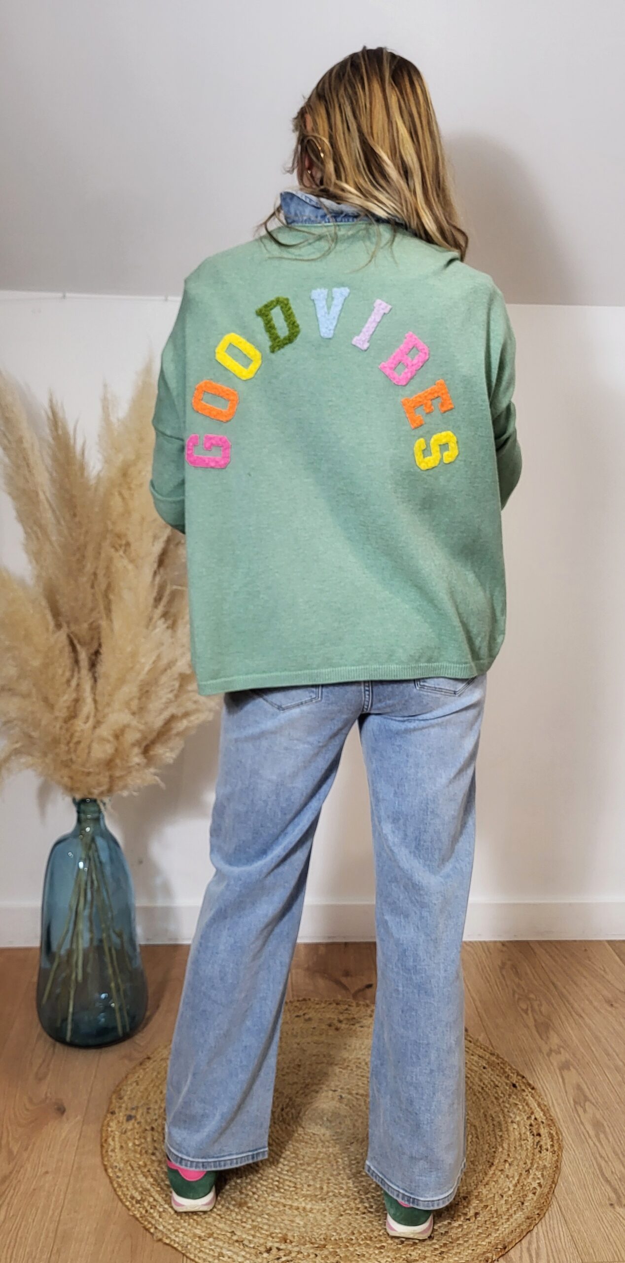 Gilet femme vert sauge en maille douce avec coupe fluide et manches longues. Message « GOOD VIBES » coloré au dos pour une touche fun et tendance, parfait à superposer sur un t-shirt ou une chemise.