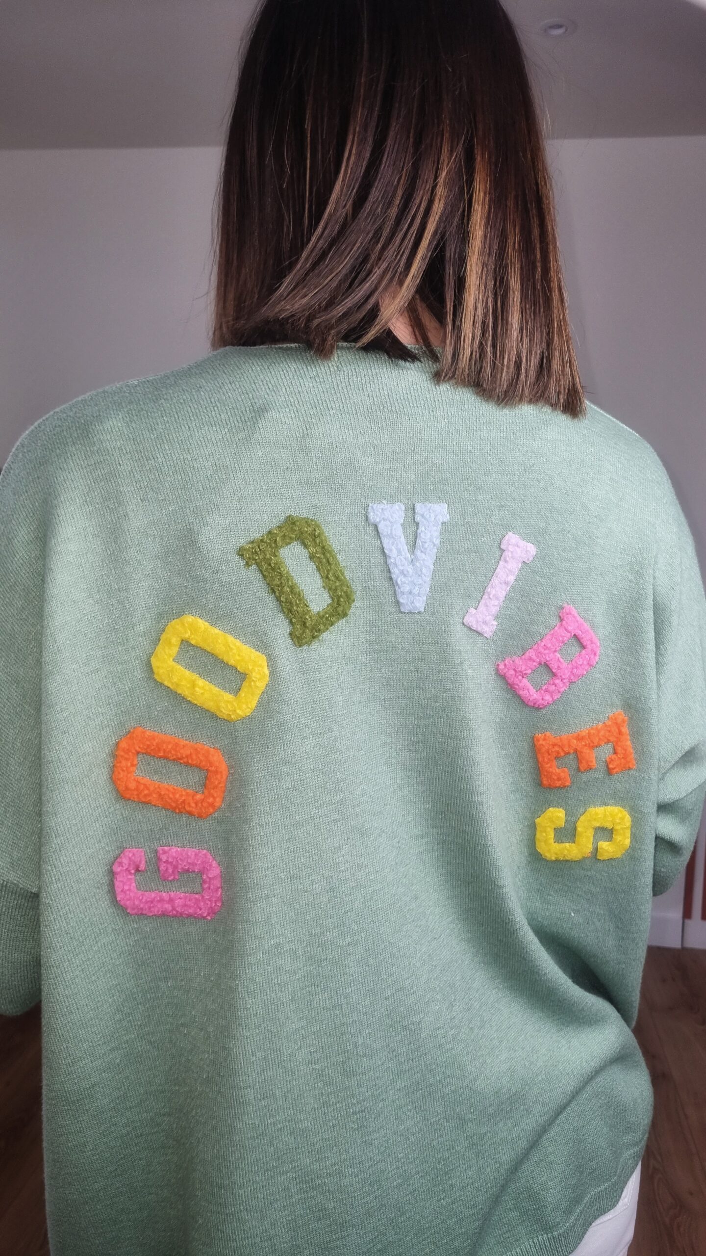 Détail lettres colorées good vibes au dos du gilet femme