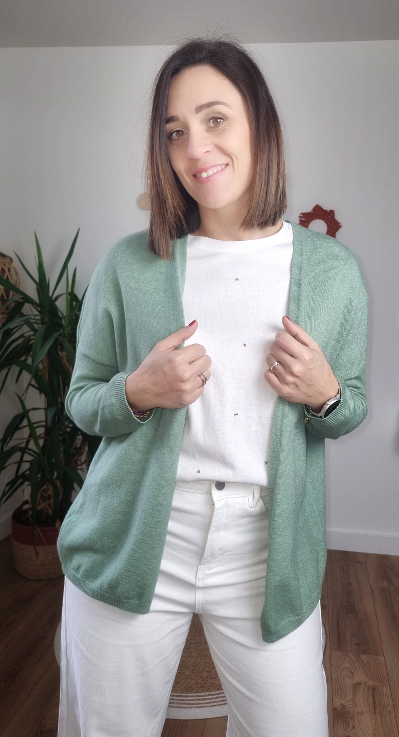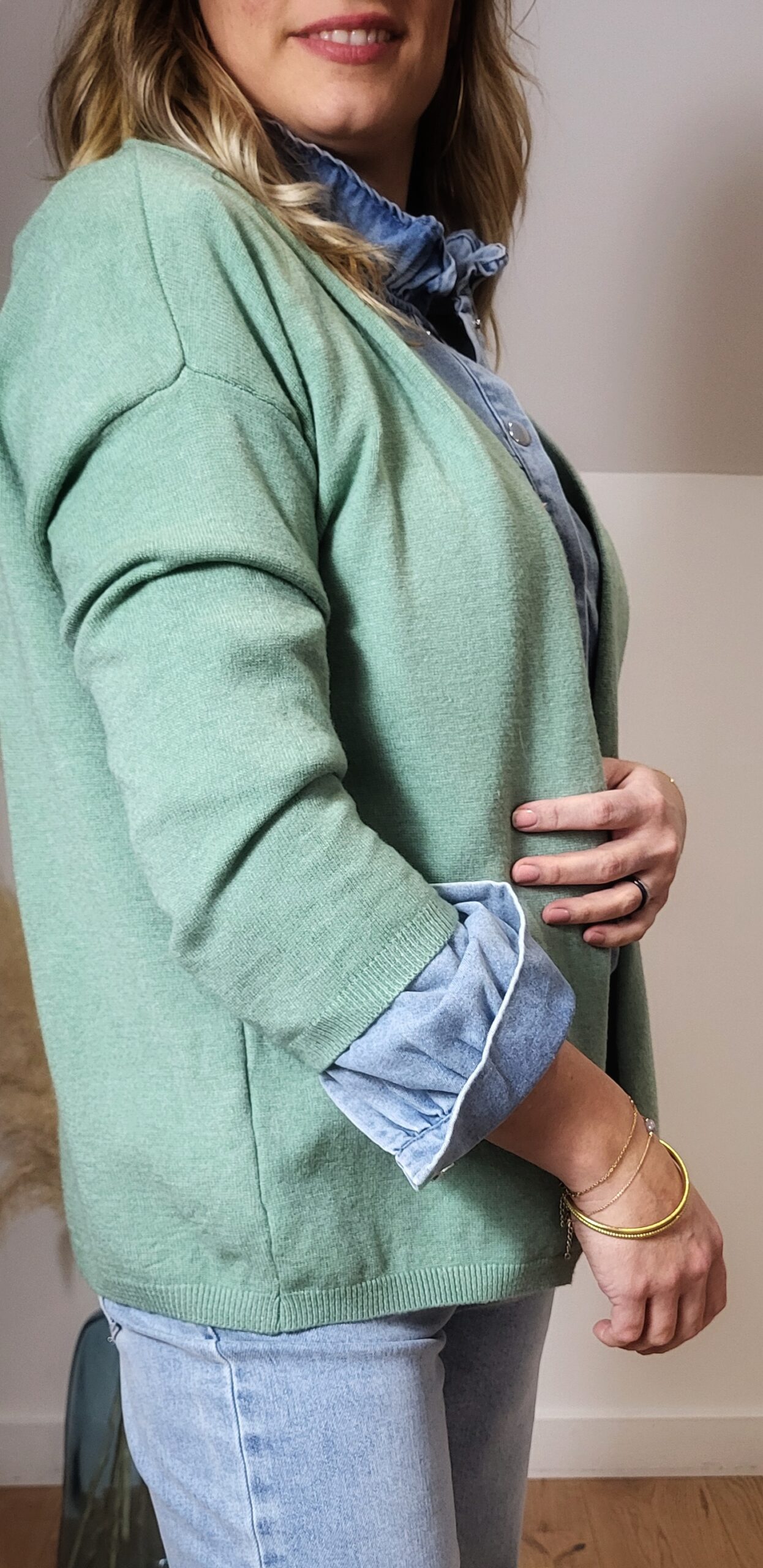 Gilet femme vert sauge porté avec chemise en jean💚 Gilet Femme Vert Sauge Good Vibes – Maille Douce & Dos Message Coloré