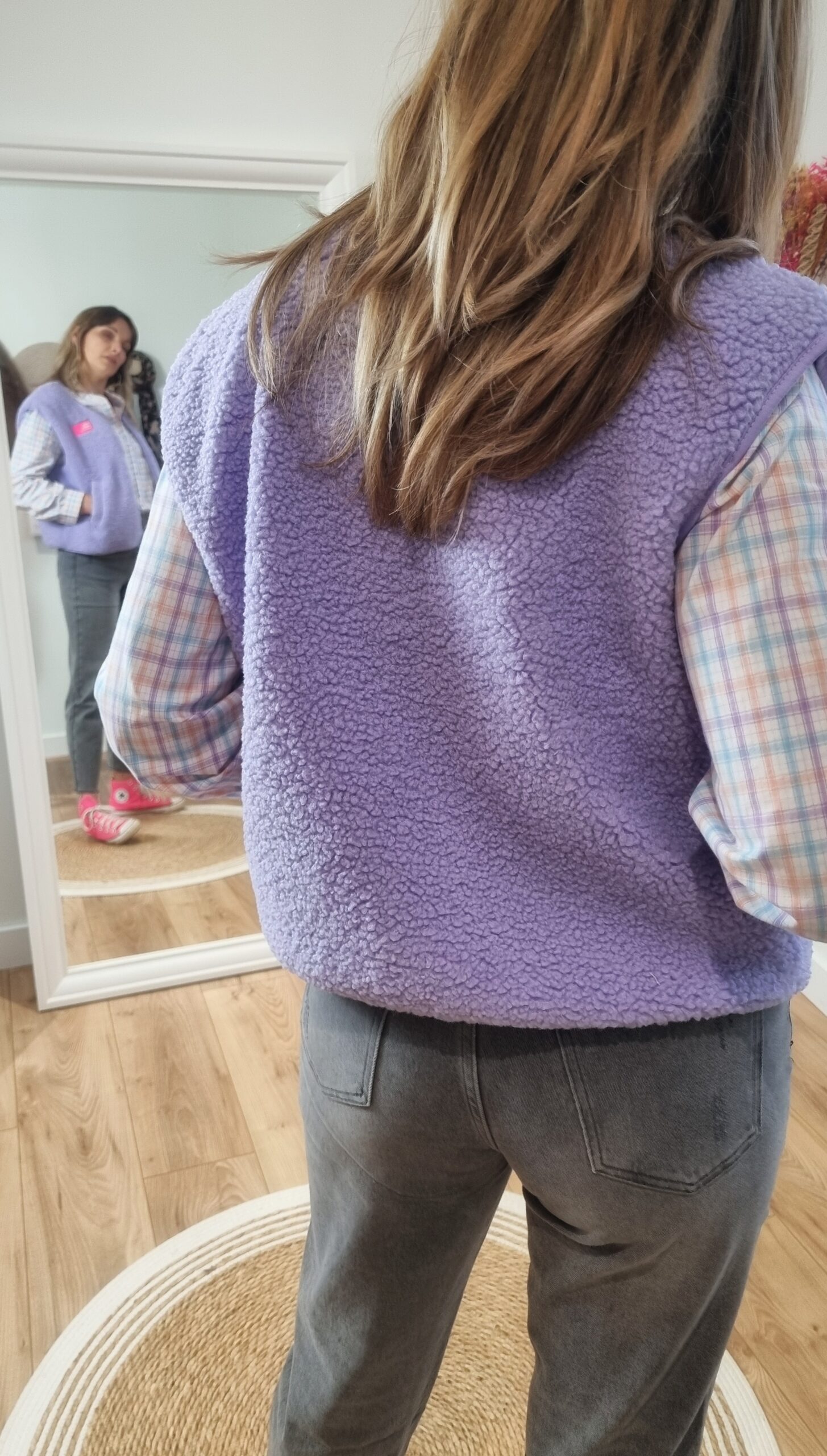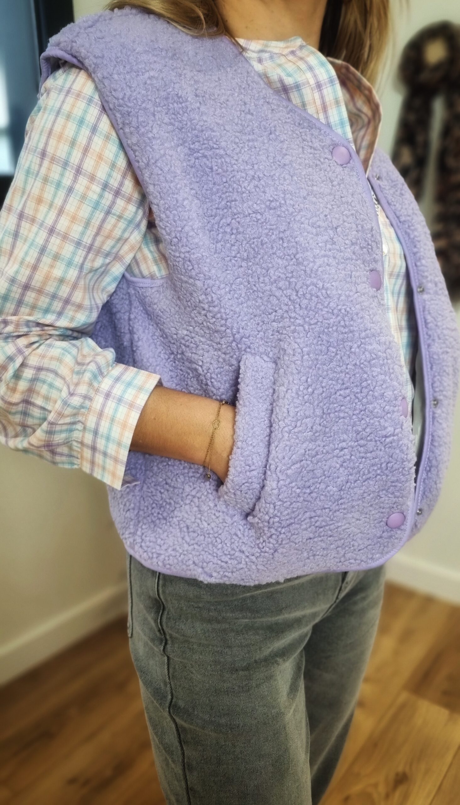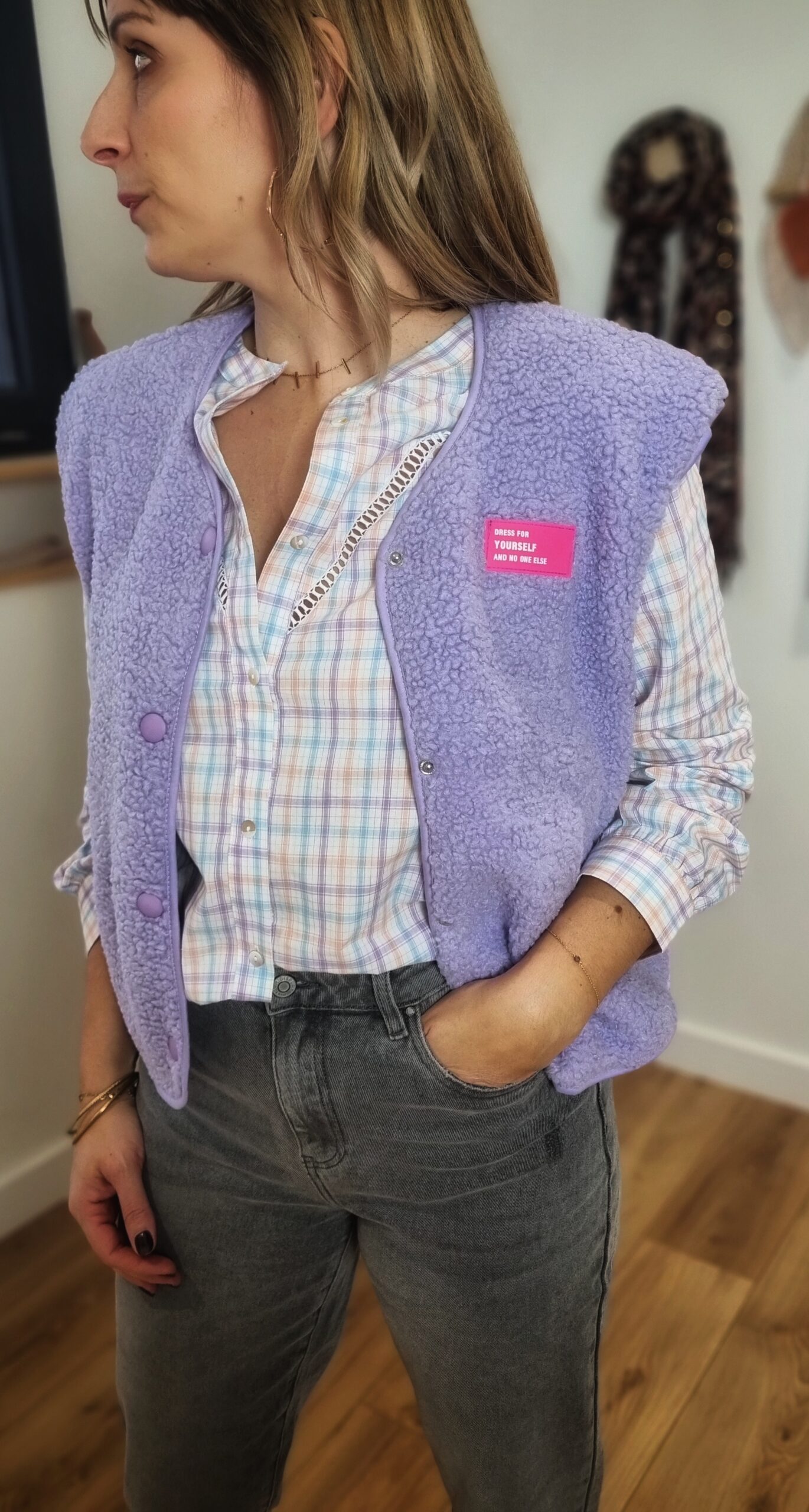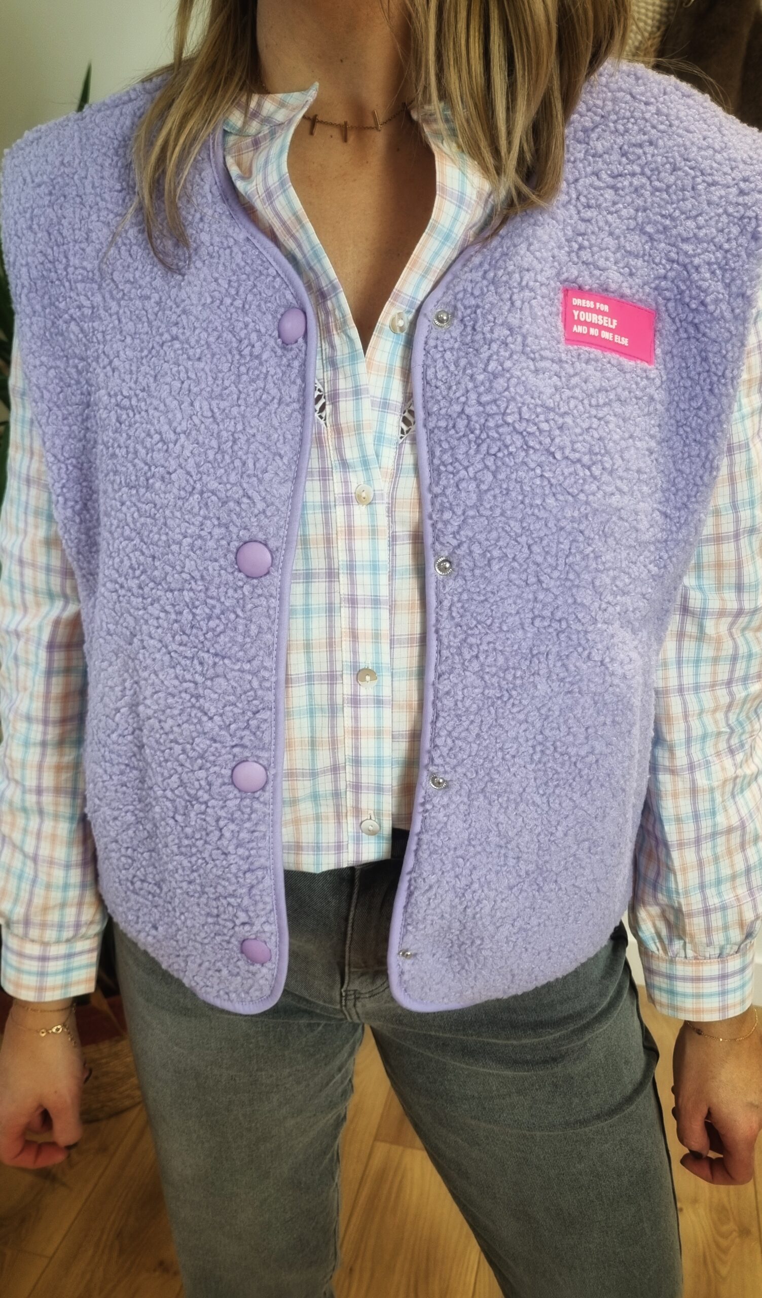 🟣 Gilet Sans Manches Femme Lilas – Effet Sherpa & Patch Message