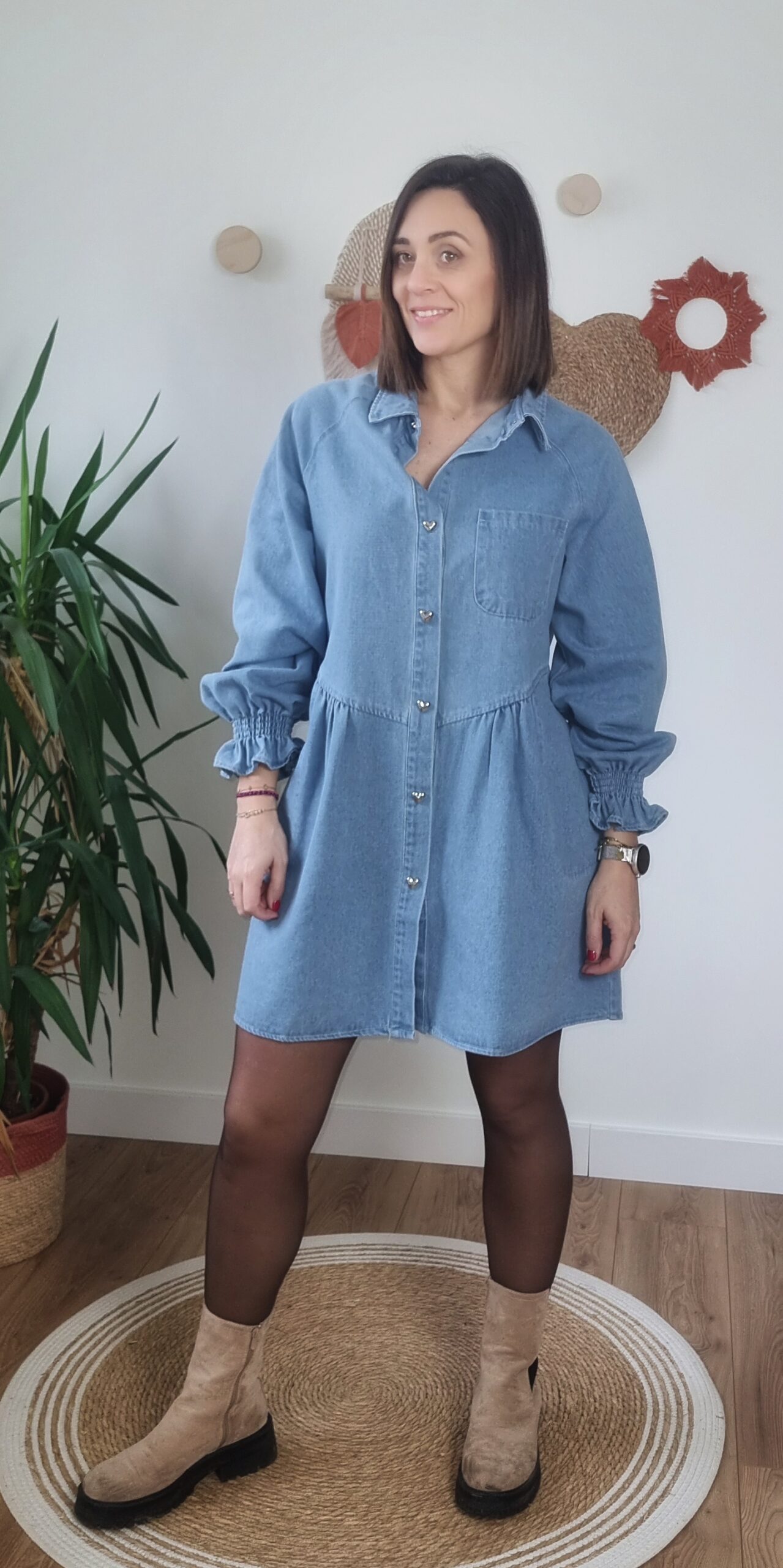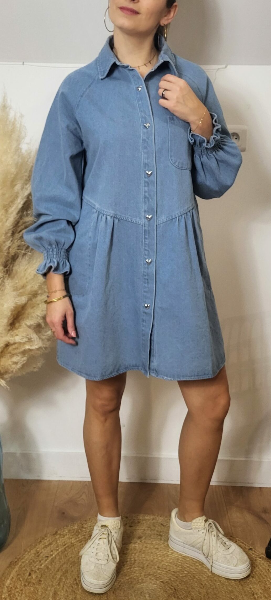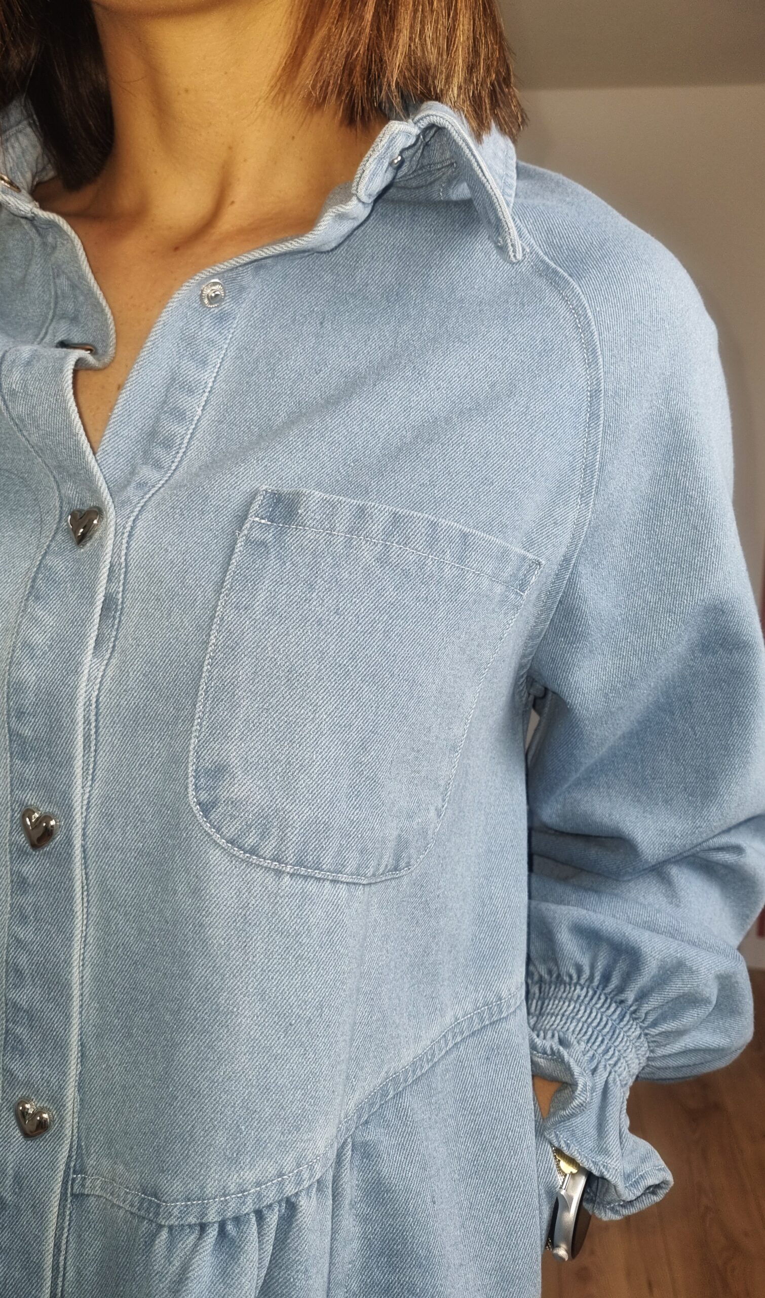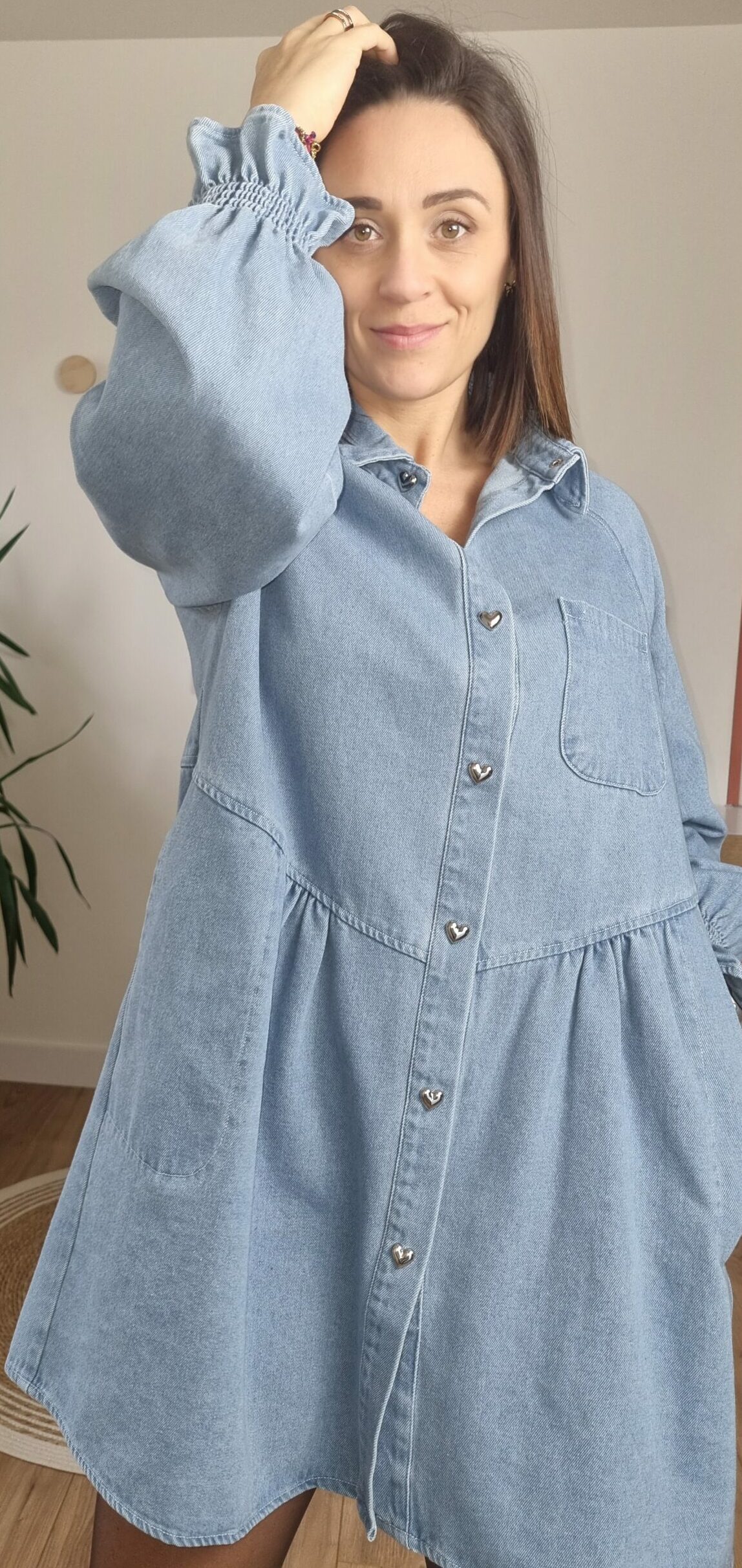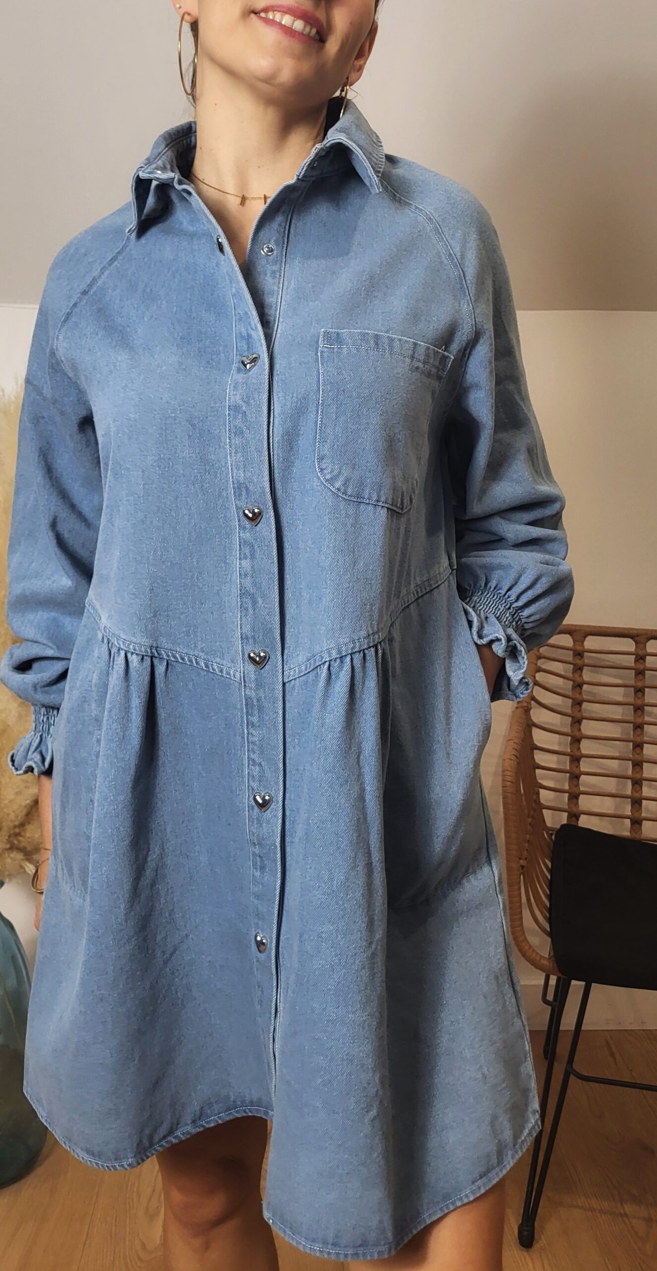 👗 Robe Chemise en Jean Bleu Clair – Boutons Cœur & Coupe Fluide