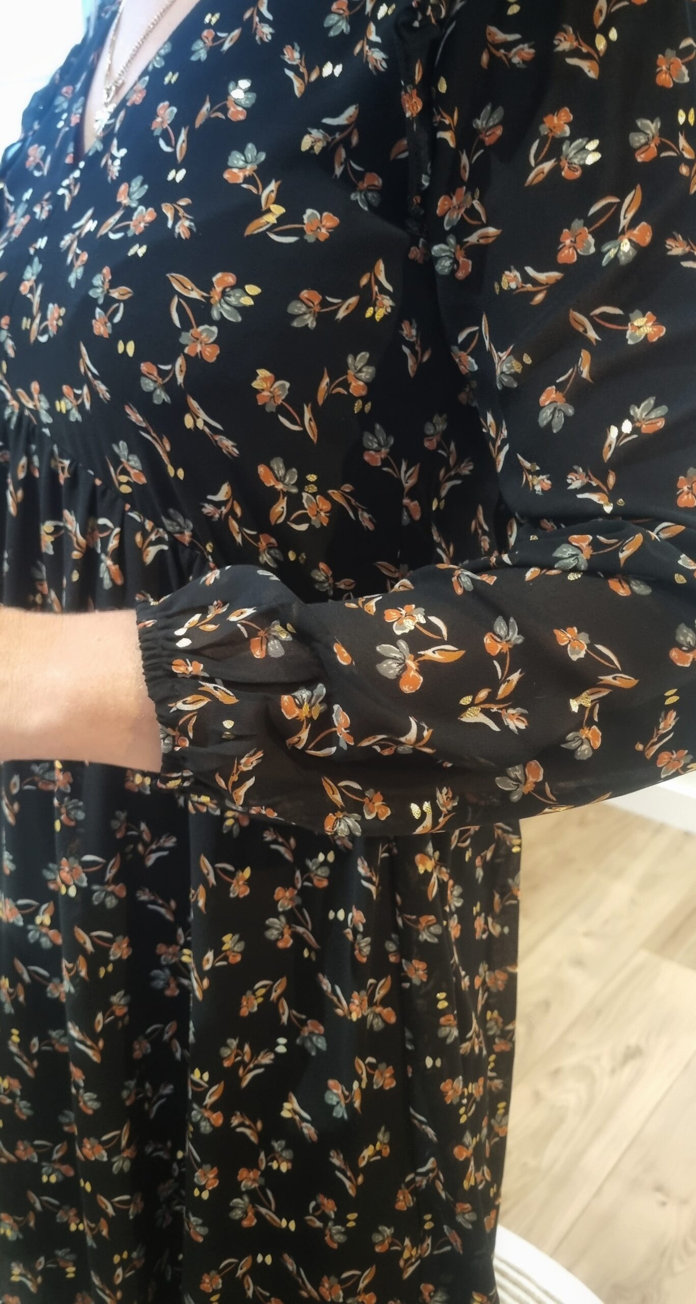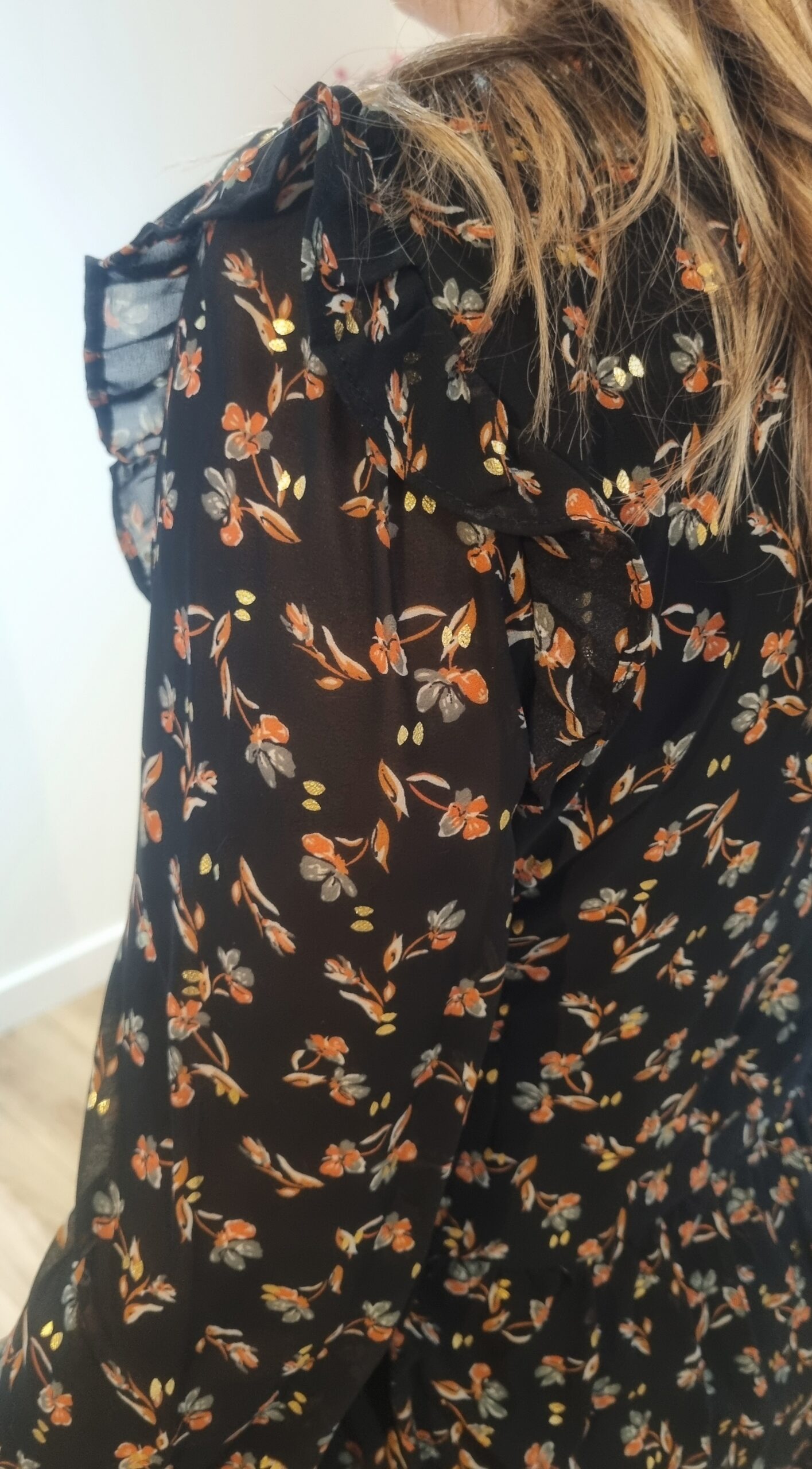 Imprimé fleuri délicat kaki et rouille sur fond noir.