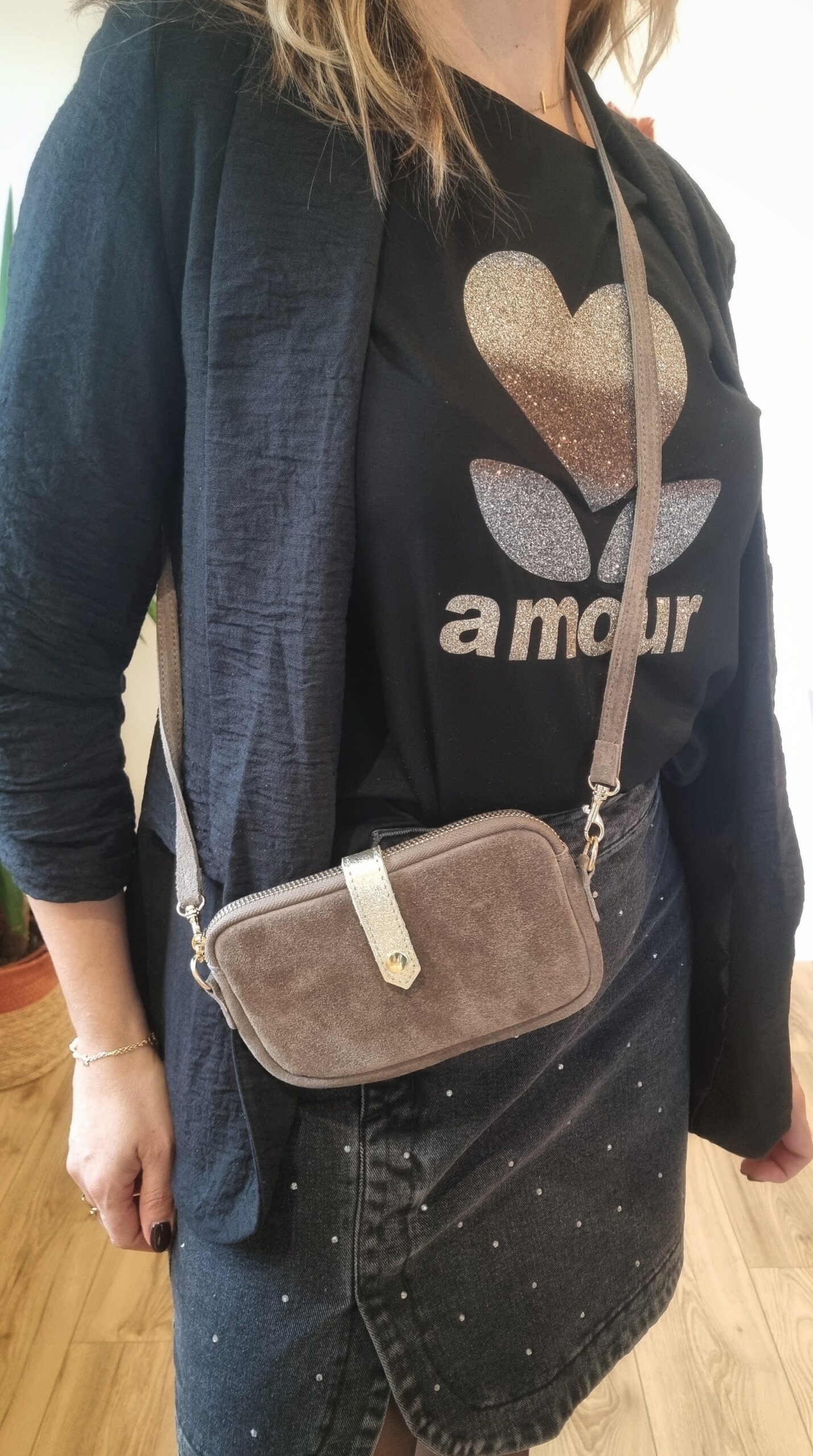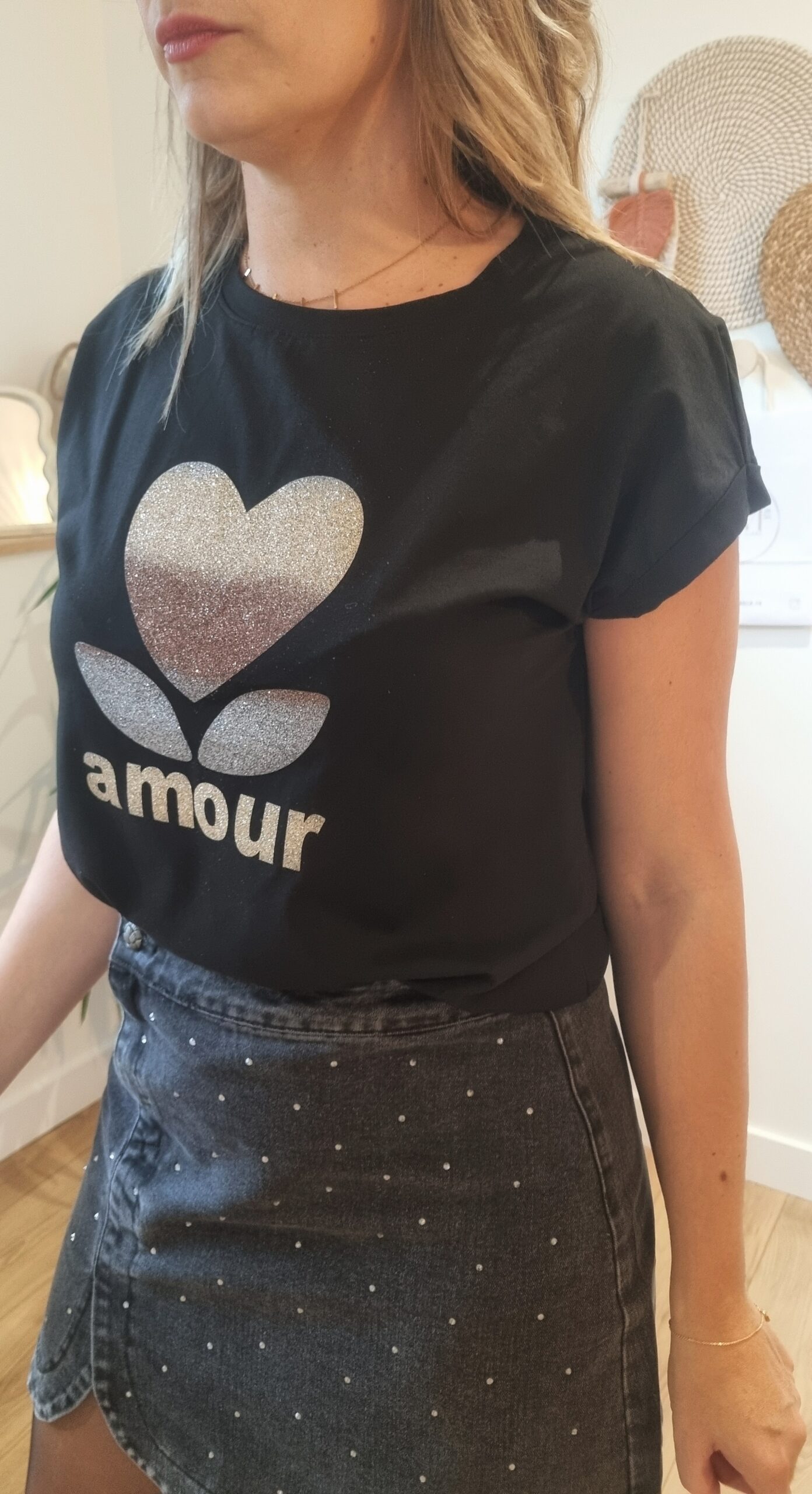 Tee-shirt noir coupe droite, imprimé “amour” en glitter dégradé argenté/doré. Confortable, lumineux et parfait pour apporter une touche stylée à vos looks du quotidien.