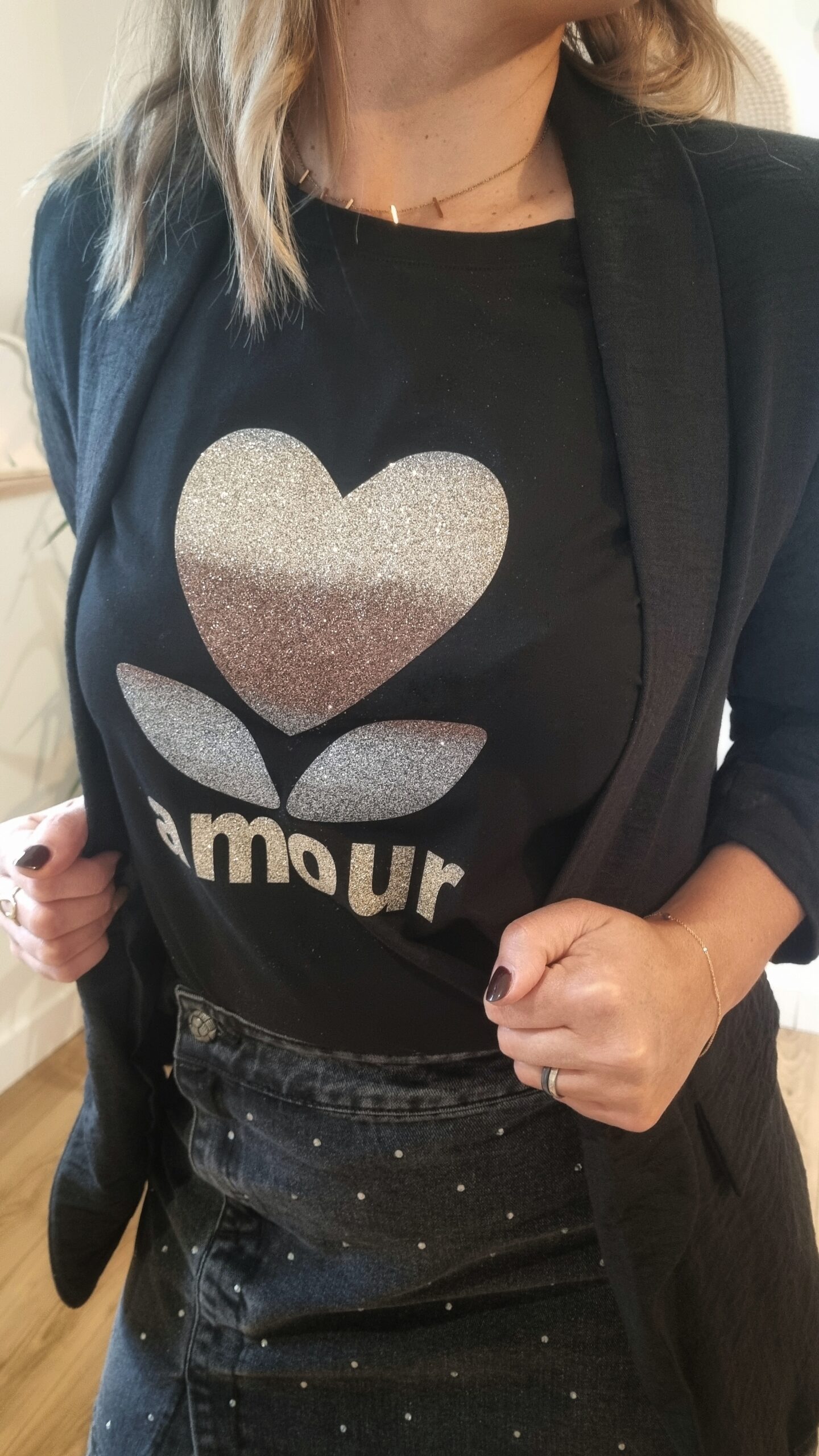 🌸 Tee-shirt noir femme “Amour” – Motif glitter dégradé