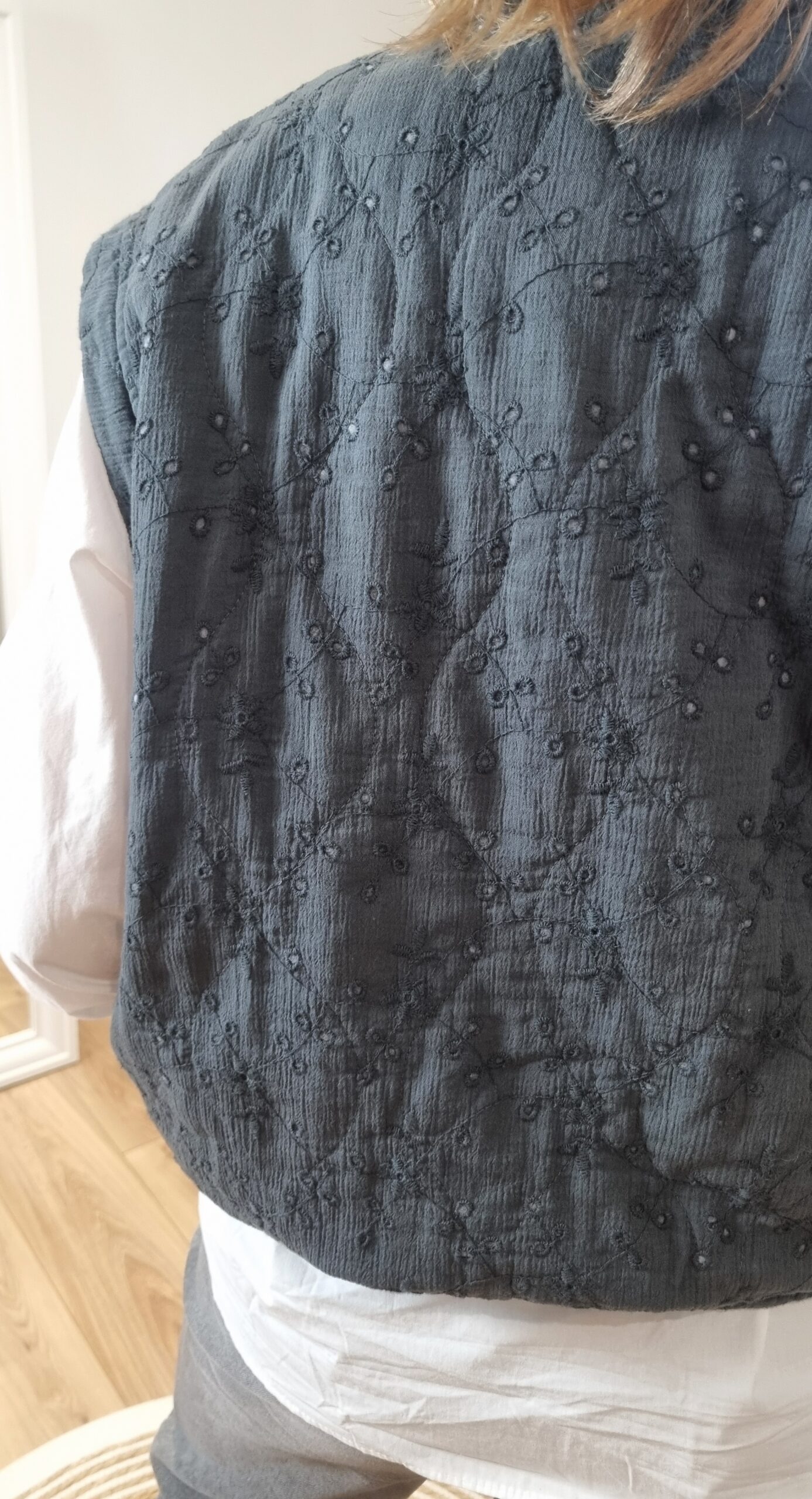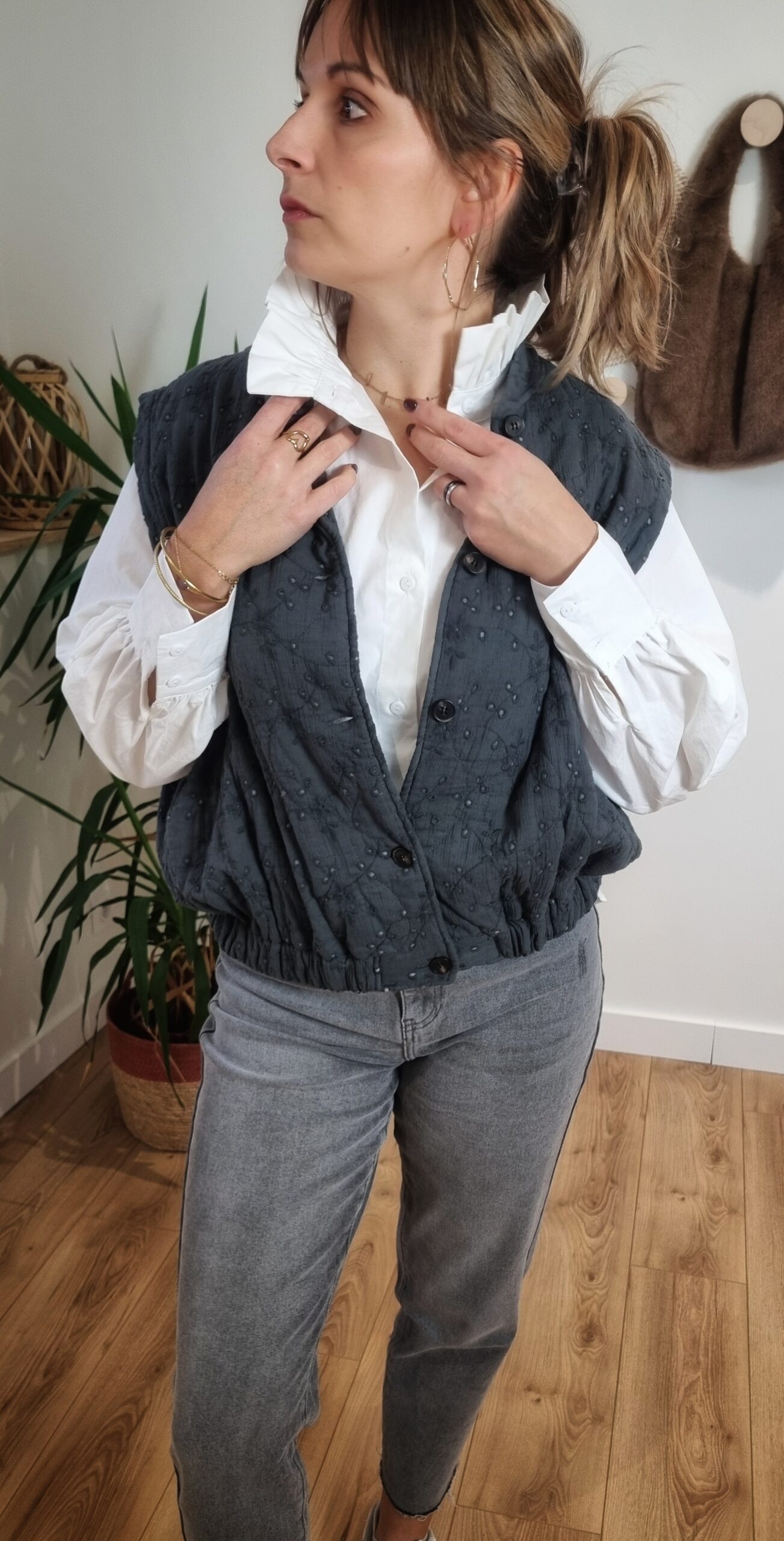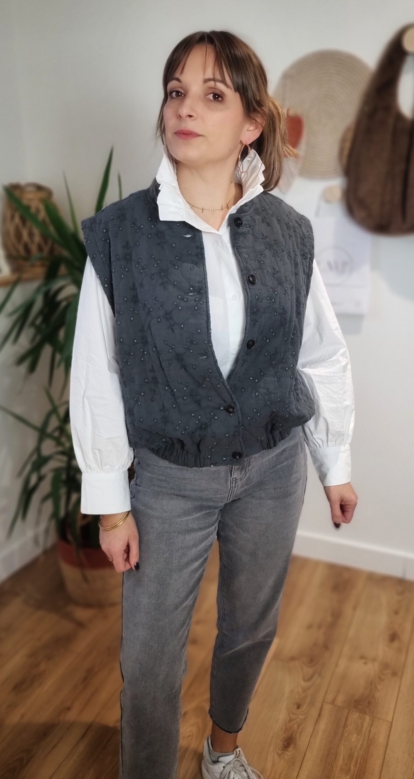 🖤 Veste Sans Manche Brodée Anthracite – Boutonnée & Doublée